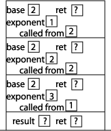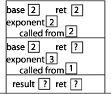 Now we can start executing the statements inside power. Since exponent is not equal to 0, we execute the "else" part of the if statement, which involves a method call to the method power, this time with arguments 2 and 2. We put a "2" in the called from memory location to indicate that the method was called from within power. Setting up that activation record results in this picture of the stack: