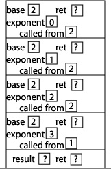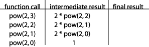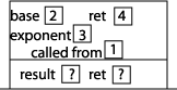 Let's take a look at what happens when we call our power method with arguments 2 and 3. Here is the initial setup of our table: