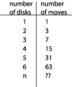 The key to finding a formula for moving n disks is to notice that you can get each of the numbers in the right column of this table by taking 2 raised to the power of the corresponding number in the left column and then subtracting 1. In other words, if the number of disks is n, the number of moves required is 2n - 1.