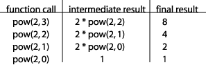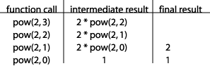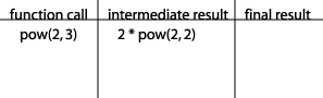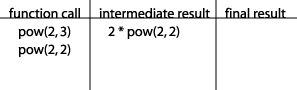 We are now faced with the problem that we don't know what power(2, 2) is. So we start a new row in our table, placing power(2, 2) in the first column because that is now what we need to compute: